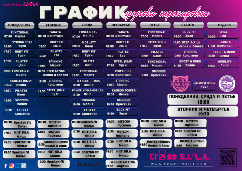 Силови тренировки: Класове като SpartaN.Fit, HIIT SILA, Metcon, вдигане на тежести и Barbell&Speed, където се използват тежести или собствено тегло за укрепване на мускулатурата.